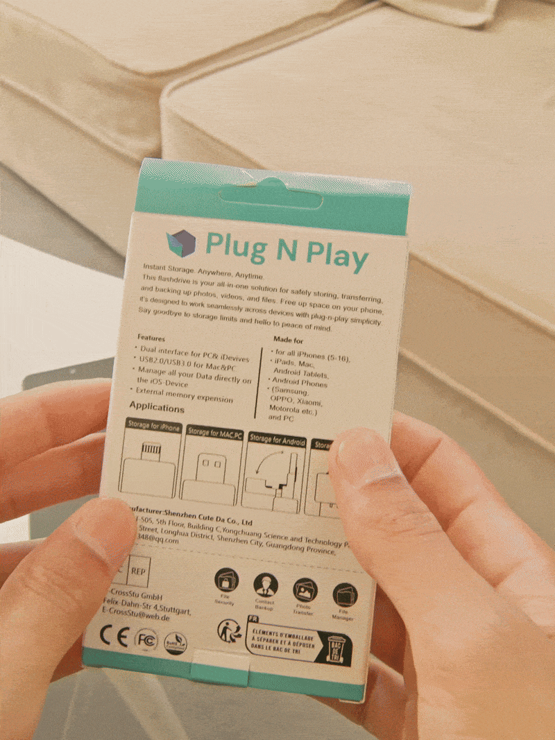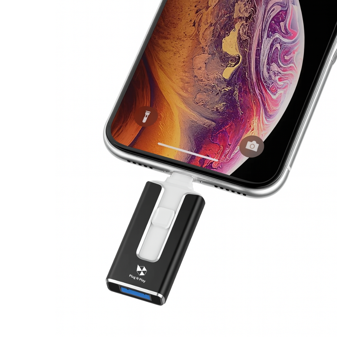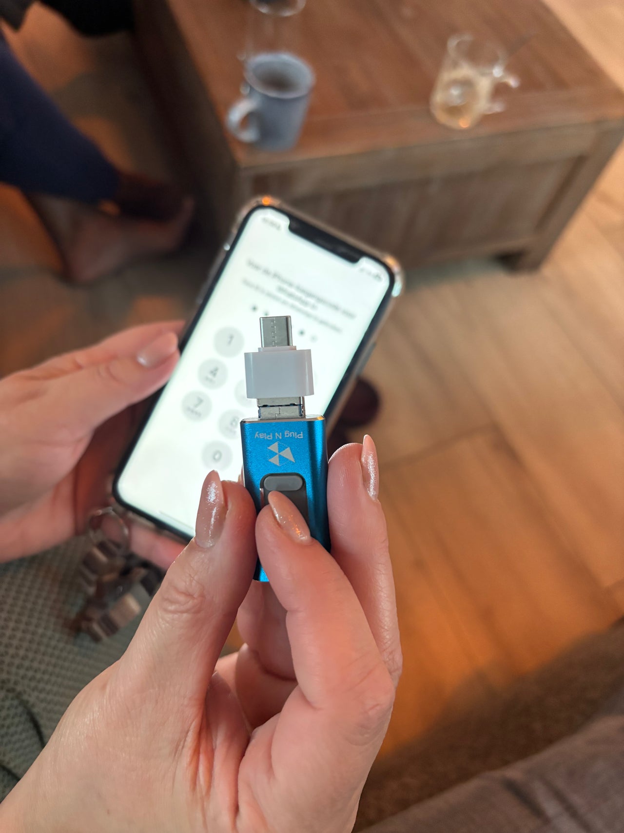 De stick heeft ook een USB-C en Micro-USB aansluiting, waardoor hij op alle Android-telefoons werkt. Samsung, Huawei, Xiaomi, Oppo, Nokia — allemaal compatibel.
